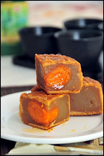So, this is how a traditional moon cake looks like. This particular moon cake is with white lotus seed paste and double preserved egg yolks fillings (my favorite type and combinations). Not kidding you, the bakers managed to jam 4 yolks in one moon cake, I think that’s a bit too much though. Some other combination of fillings include but not limited to ham and nuts! Aren’t these supposed to be desserts? Oh well, that’s why I usually stick with the traditional ones. Anyway,when I cut into this moon cake, the natural oil from the yolk burst and started dripping. I was thinking wow, that’s such a nice yolk! It surely was a pleasant surprise. Then the fragrant from the white lotus seed paste and yolks filled the whole room. I couldn’t wait to take a bite (that’s so not me, remember, I don’t really like moon cakes)! Look at the inside of the moon cake! Does the preserved egg yolk look like a full moon to you? That’s the whole idea of putting a preserved egg yolk inside the moon cake, to resembling the full moon. :)