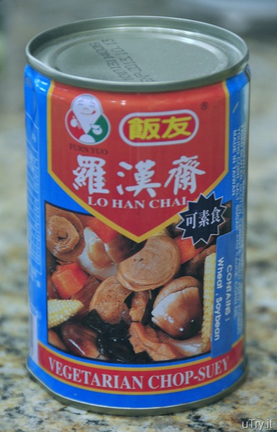 Last but not least, the secret ingredient to make this dish 'semi-home made' (and my life much easier) is a can of vegetarian chop-suey (羅漢齋).  I buy these cans all the time and never pay attention to the English name until now.  :)  The term chop-suey literally means the mixture of many chopped ingredients.   Which is exactly what’s in this can.  There are bamboo shoots, straw mushrooms, fried gluten, carrots, fried tofu, fungus, baby corn, soy sauce, salt and sugar, etc.  It’s fully seasoned and the sauce in this can is delicious.  You don’t need to add much to the rest of your ingredients except white pepper and sesame oil.