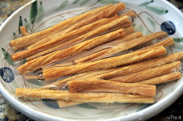First, we need some vegetarian protein sticks.  What a funny name, huh?!  They are actually dried soybean curd.  They are convenience to use, nutritious and has a great texture.  You can find them in most Asian supermarkets.
