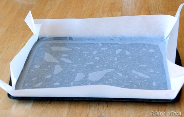 Here’s the step-by-step pictorial. First, preheat the oven to 375 degree F. and grease a 10 by 15-inch baking pan with cooking spray. Then, line the pan with parchment paper. Make sure the parchment pager is large enough to have at least 2-inch excess on all sides for easy removal when the cake is done.