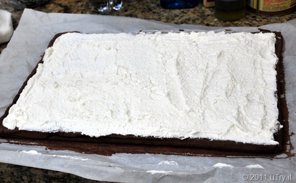 Gently spread the filling onto completely cooled cake. Roll the cake up, from the shorter end.