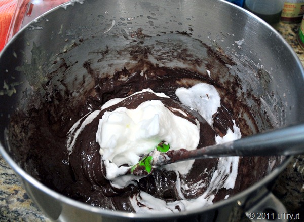Add 1/3 of the egg whites into the batter and stir until batter is lightened. Do not worry about deflating the egg white here.