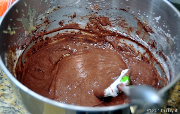 Then, gently fold in the remaining egg whites in two batches. Need to be careful now not to over beat the batter and deflate the egg whites too much.