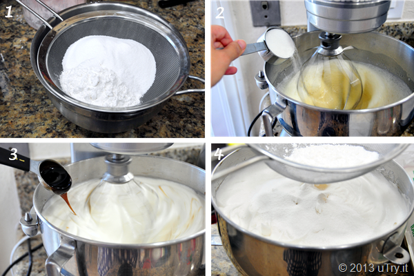 In the bowl of the stand mixer with the whisk attachment, beat the egg whites, tea, and cream of tartar until foamy, about 2 minutes. Then, slowly add the remaining 3/4 cup of sugar. Beat until medium peaks form. Then, beat in the vanilla bean paste until incorporated.