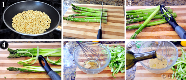 6) While whisking, slowly drizzle in the olive oil until vinaigrette emulsified. Add salt and pepper, to taste. Gently toss enough vinaigrette to moisten the asparagus ribbons. You might not need all the vinaigrette. You can toss in the pine nuts, or sprinkle them on top. With a vegetable peeler, shave a few parmigiano reggiano on top and enjoy!