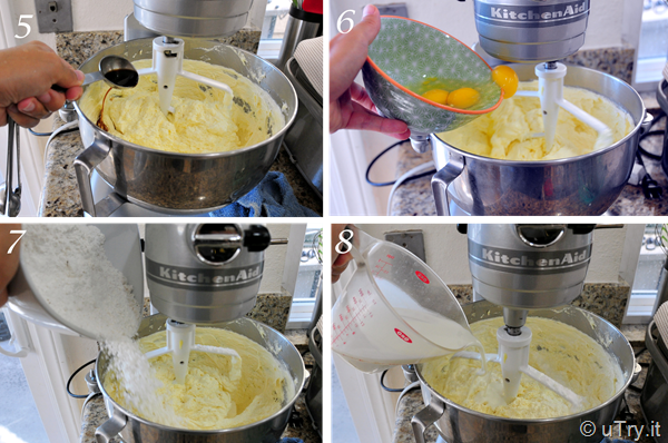 3) In the bowl of the stand mixer fitted with the paddle attachment, with medium speed, cream the butter, sugar and salt together for 5 minutes until light and fluffy.